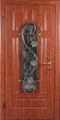 Полотно двери данной модели глухое, однако, украшено стеклянной вставкой. В центре имеется искусно сделанная кованая решётка в виде виноградной лозы. Такой дверной блок идеально впишется в экстерьер загородного коттеджа.