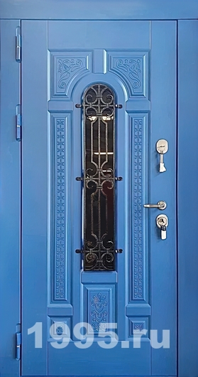 Синяя дверь окрас по RAL, с ажурным рисунком, стеклом и ковкой